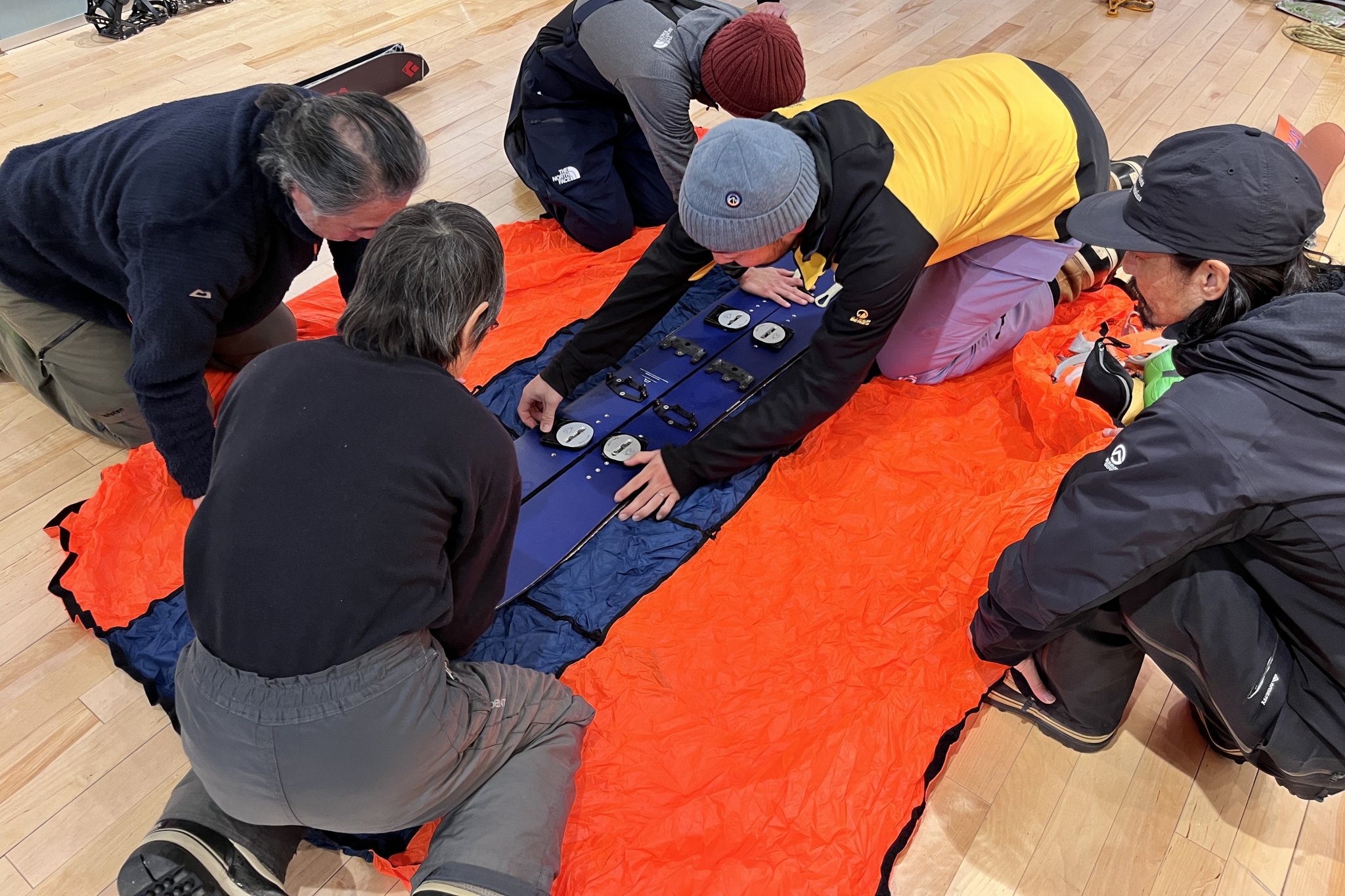 それを踏まえて、参加者の皆さんでラッピング~雪上搬送まで実践です。