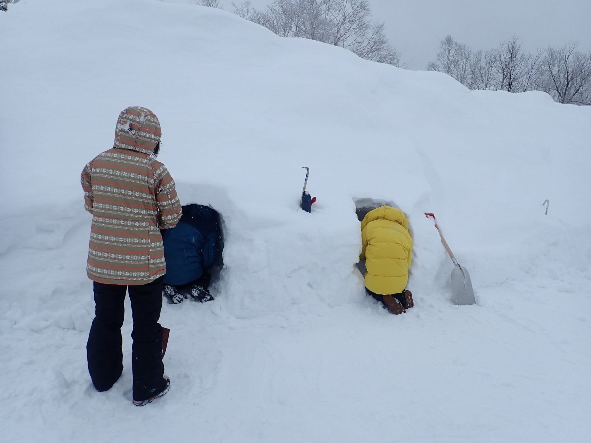男性スタッフもサポートしましたが、女性3名で見事に雪洞を掘りきりました!