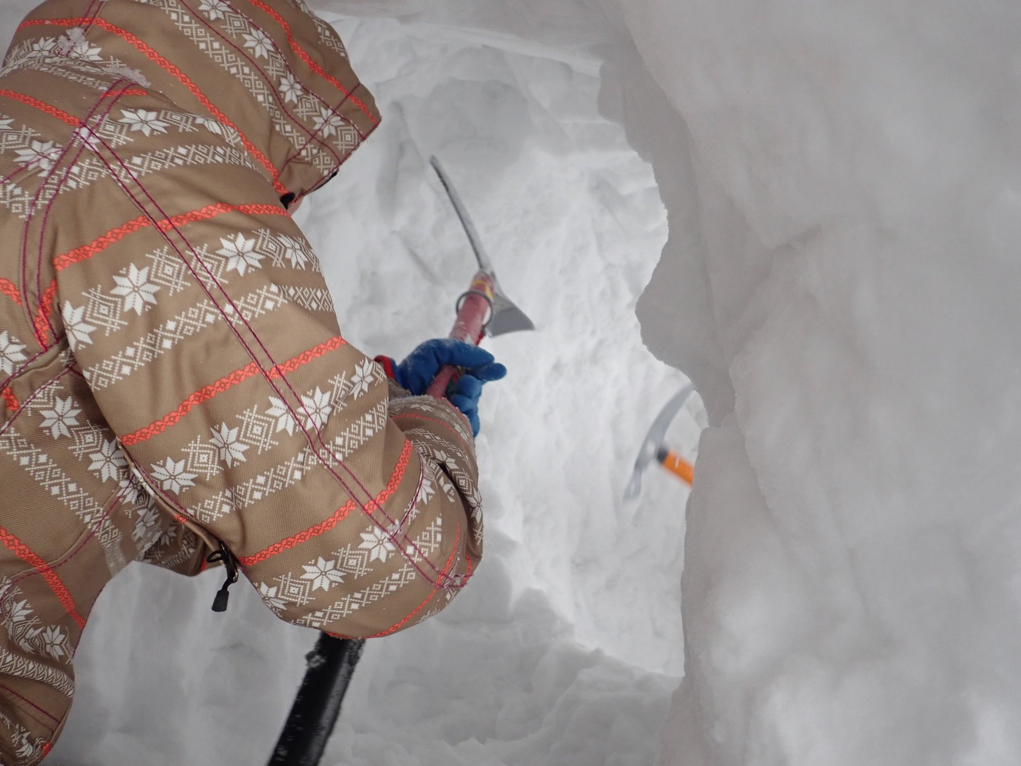 奥は本当に重く硬い雪なので、ピッケルを使って掘り進めます。