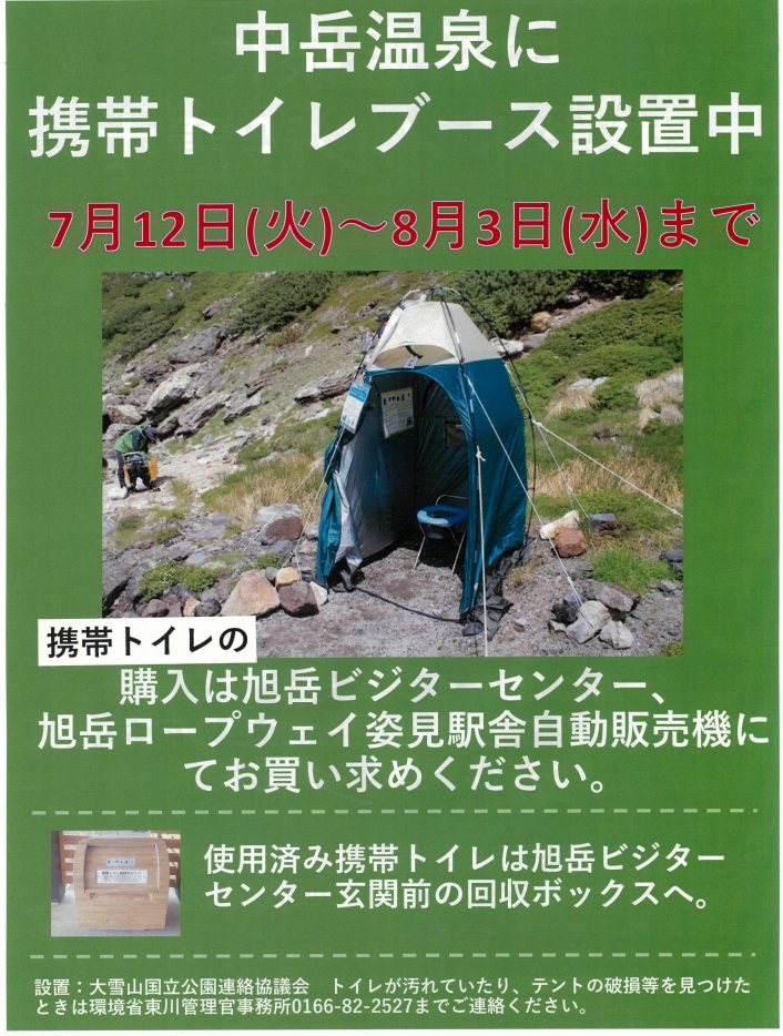 今年も期間限定で、中岳温泉に携帯トイレブースが設置されます。