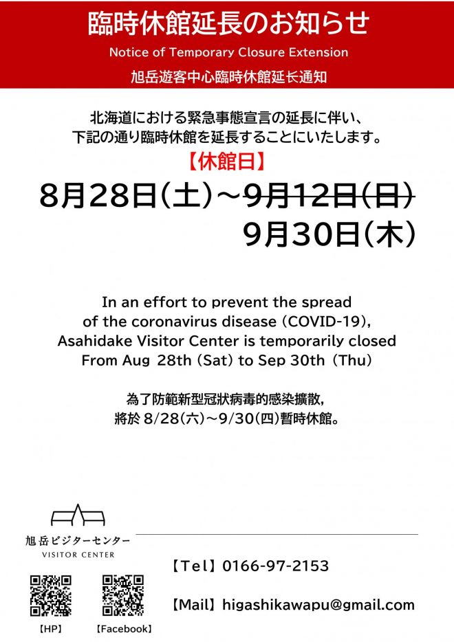 環境省直轄の旭岳ビジターセンターは8月28日より9月12日まで臨時休館としておりましたが、