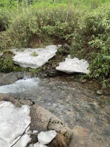 雪渓が残っていて、雪渓の端は下に深さ50cm以上の空洞ができていますので、十分お気をつけください。