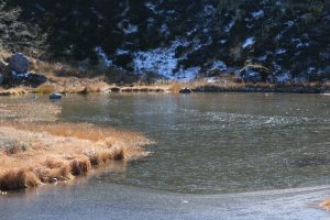 晴れてるとはいえ氷点下の気温で防寒対策は必須です。駅前の池は氷が張っていました。