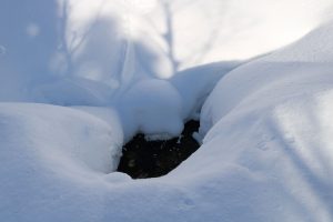 ロータリー方面からカモ沼方面へ進むと、途中に小川や湿地があり雪の窪みが見受けられます。