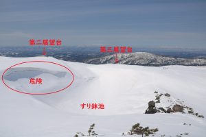 第二、第三、第四展望台の近くに池があり、冬季の時は真っ白で前が見えにくい可能性がありますので、
