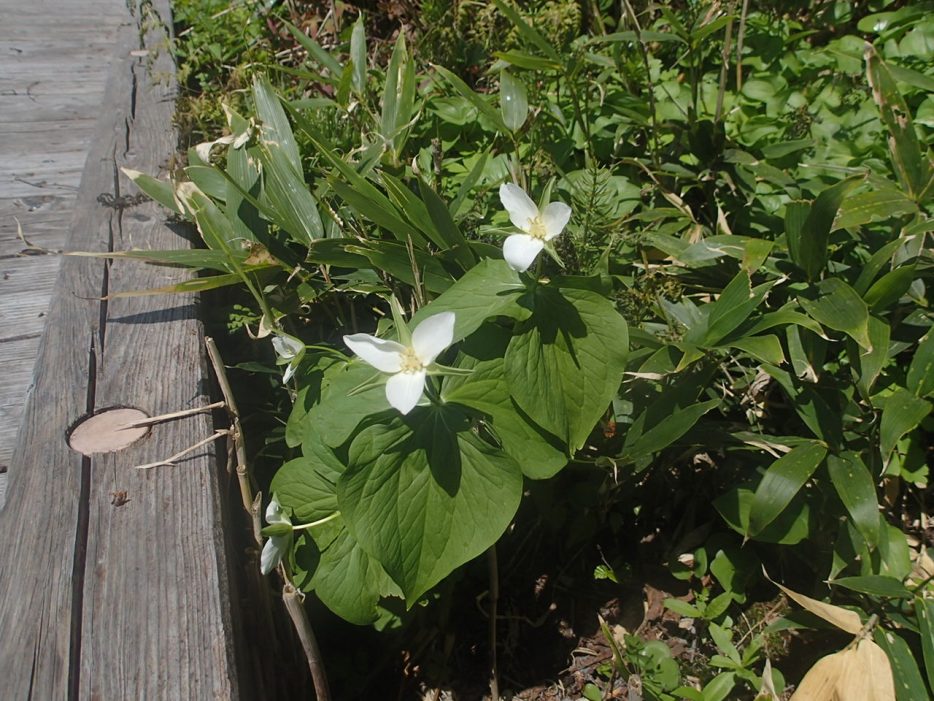 山麓駅から駅前駐車場をはさんだ反対側に、チシマザクラ20本ほどの植栽地があり、奥側のほうから開花が進んでいます。「千島桜」の看板のところから入って行って、左の奥の方の2株ほどを見てください。6割がた開花しており、それに近い株のツボミもピンクいろが濃くなっており、開花寸前です。今週末はかなり多くの花が見られそうです。 (三角形の白い花オオバナノエンレイソウと、細かい白花オオバタネツケバナは、駅裏湿原の木道沿いでみられる草花です。