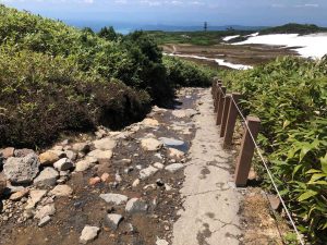 姿見展望台から姿見駅方面は融雪の影響で、散策路は小川のように水が流れているところがあります。