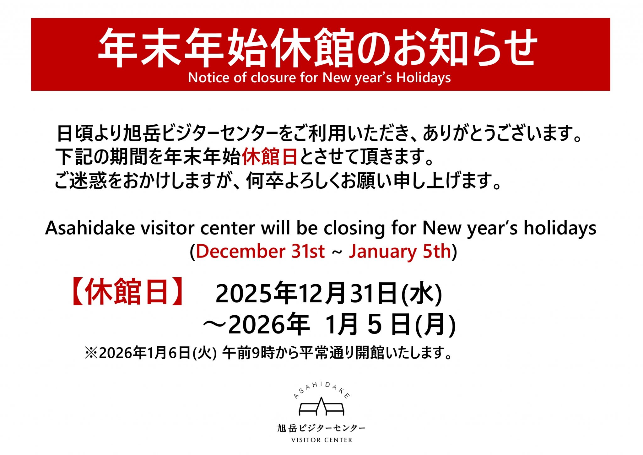 The Visitor Center will be open as normal from 6th January.