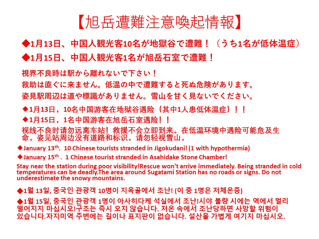 January 15th .  1 Chinese tourist stranded in Asahidake Stone Chamber!
