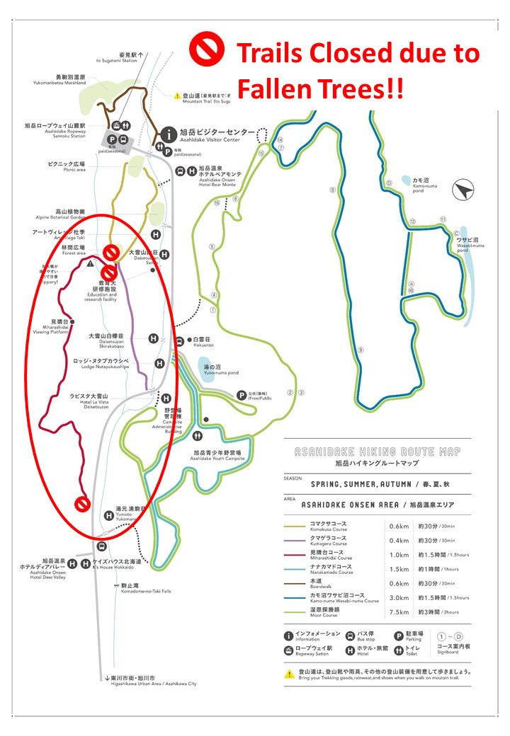 Among the several walking trails near the Asahidake Visitor Center, the Observation Deck Course(Miharashidai Course) has become impassable due to several fallen trees on the trail caused by last week’s strong winds.